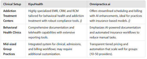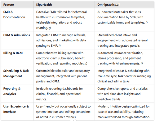 KipuHealth offers a depth of customization and integration especially suited for addiction treatment and behavioral health centers, while Omnipractice.ai leverages modern AI and automation to reduce manual workload, offer transparent pricing, and enhance operational efficiency.